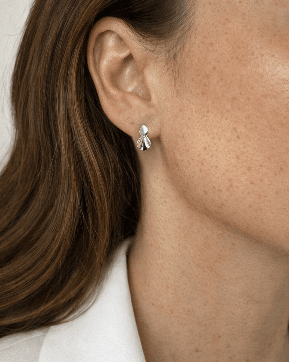 Ett par små dinglande silver örhängen på stift. Smycket består av två organiska former, ett mindre och ett större, som överlappar varandra i polerat återvunnet silver. Elegant och feminint smycke med inspiration från blomblad.