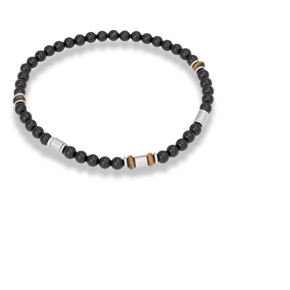 Ett elastiskt armband med svarta ädelstenar av onyx & tigeröga, kombinerat med små kulor av rostfritt stål. Ett stilrent armband med subtila detaljer.