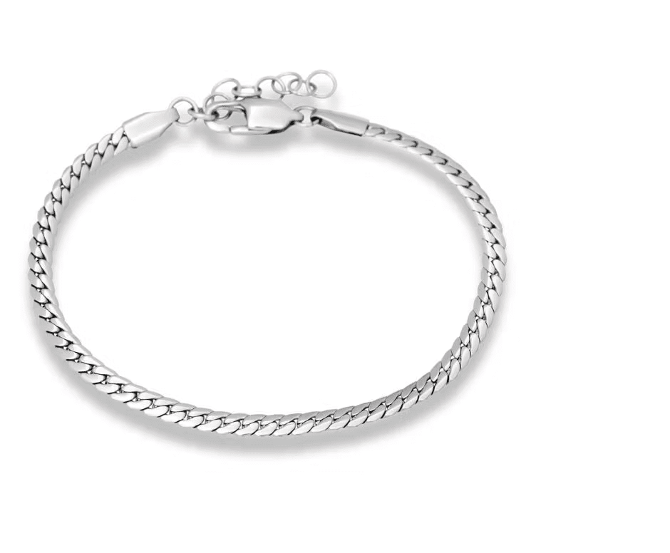 Detta platta, tätt sammanflätade armband är en sofistikerad accessoar med en elegant design.