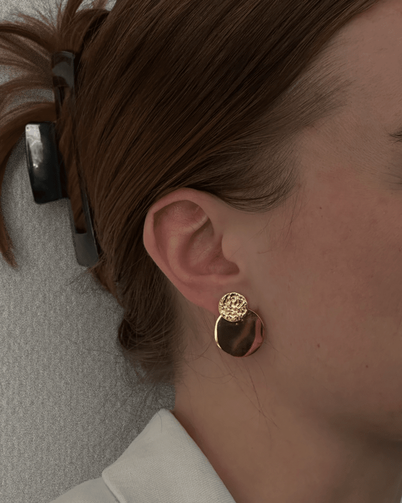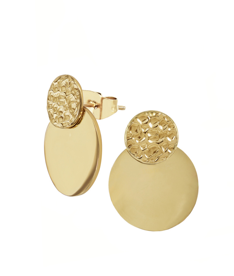 Långa örhängen på stift, tillverkade i 14 karat guldpläterat kirurgiskt rostfritt stål. Örhängena har en hamrad yta med blank finish.