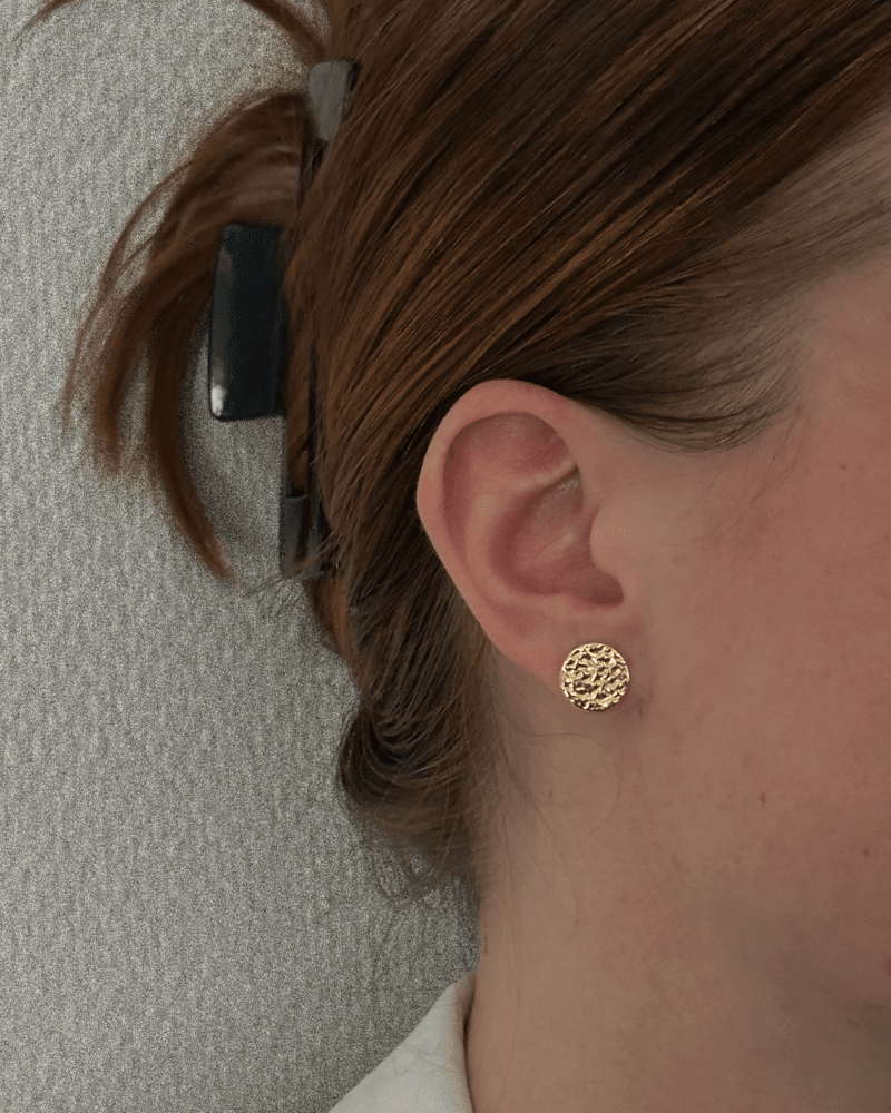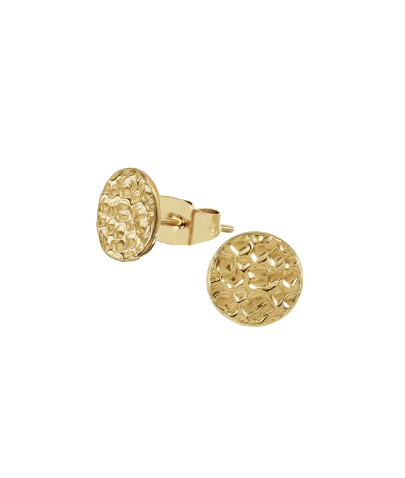Örhängen på stift, tillverkade i 14 karat guldpläterat kirurgiskt rostfritt stål. Örhängena har en hamrad yta med blank finish.