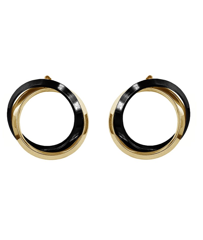 Örhängen av 2 sammanlänkade ringar, varav ringarna är i 14k Guldpläterat samt svartpläterat stål.