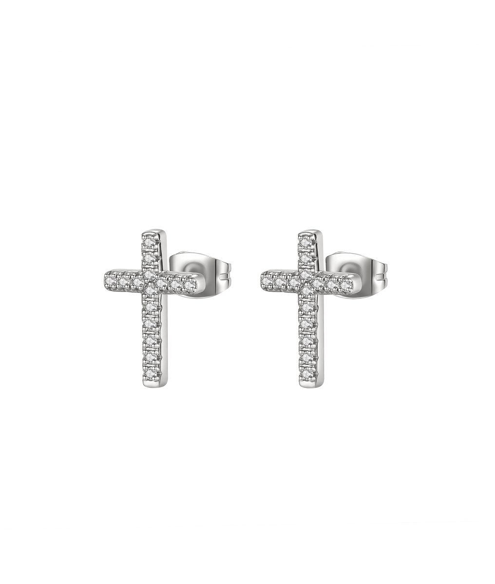 Örhängen på stift i form av ett litet kors fyllt med klara, kloinfattade kristaller.