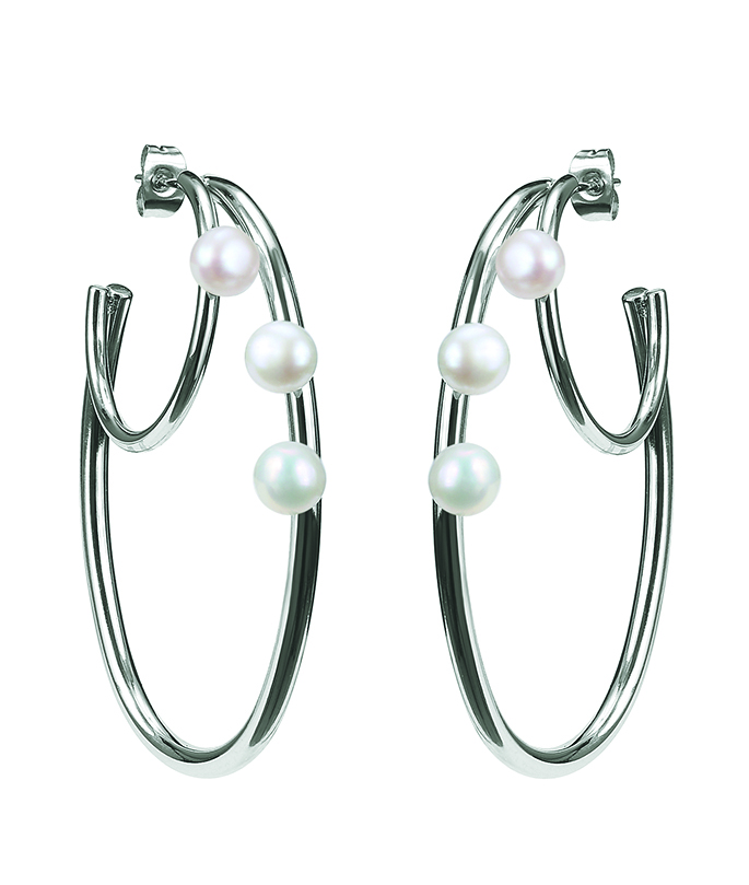 Stora örhängen i Stål av 2 ringar med 3 st äkta sötvattenspärlor framtill.