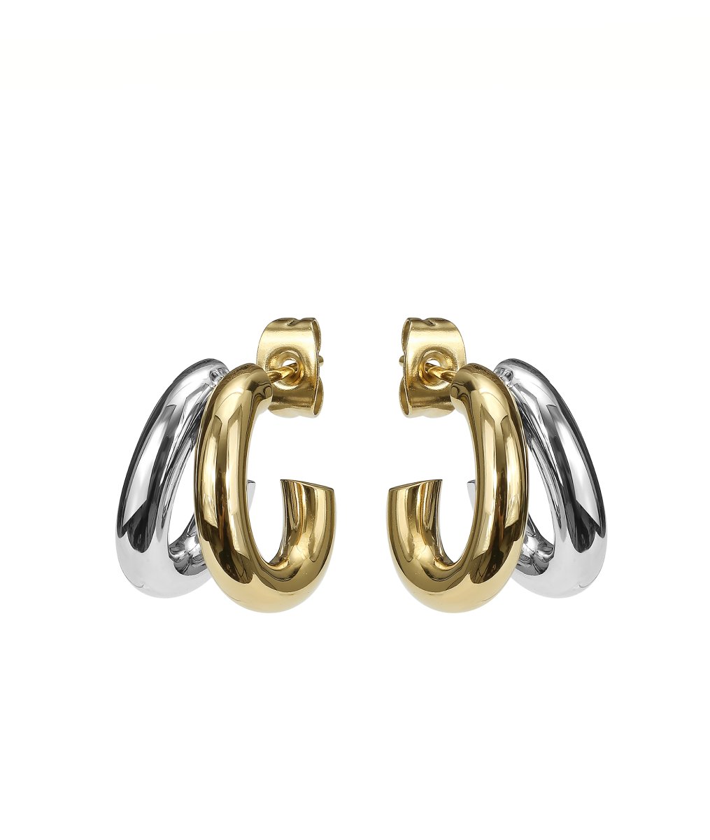 Örhängen i mix av 14k Guldpläterat stål med blankt Stål av 2st kraftiga, mjukt rundade solida ringar. Blank finish.