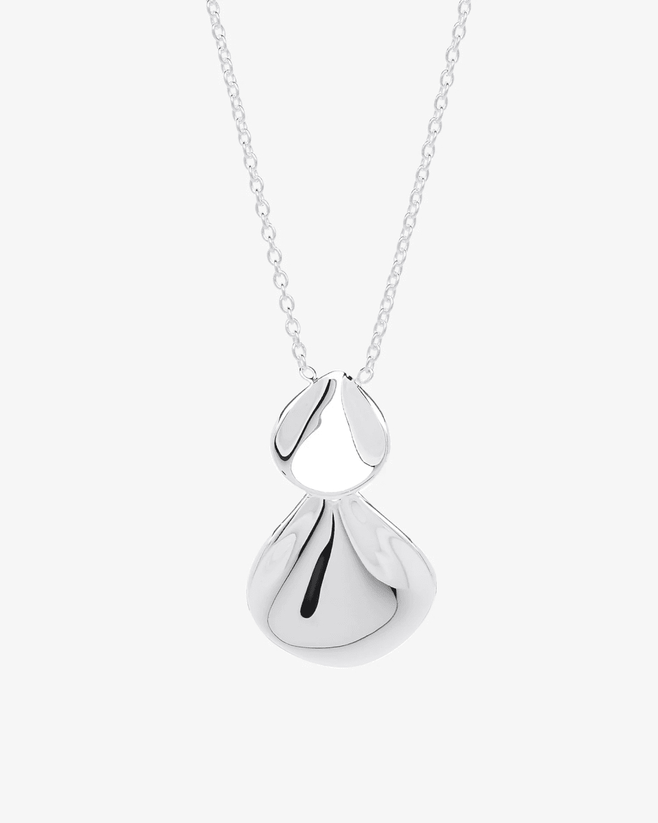 Ett vackert silverhalsband. Smycket består av två organiska former i olika storlekar, ett mindre och ett större, som överlappar varandra. Elegant och feminint smycke inspirerat av blomblad.