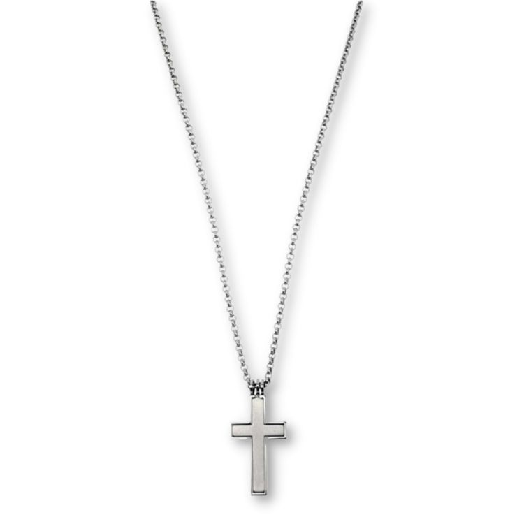 Ett tunt halsband på 70 cm med korshänge i rostfritt stål. Korset har en borstad finish med detaljer av putsat stål längs kanterna.