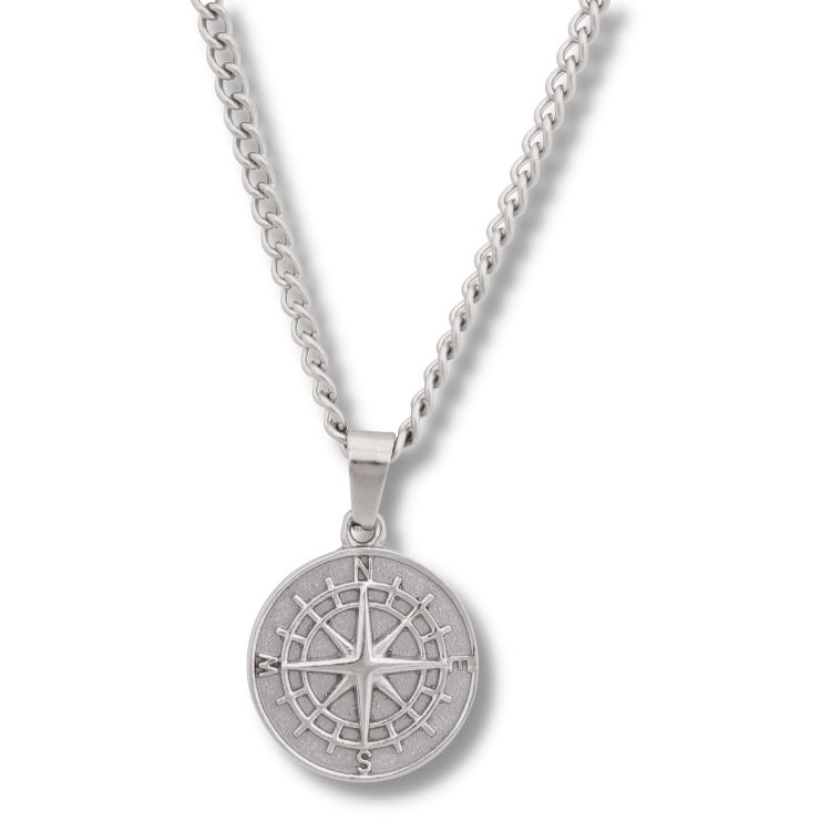 En tunn kedja i rostfritt stål med ett hänge utformat som en kompass.