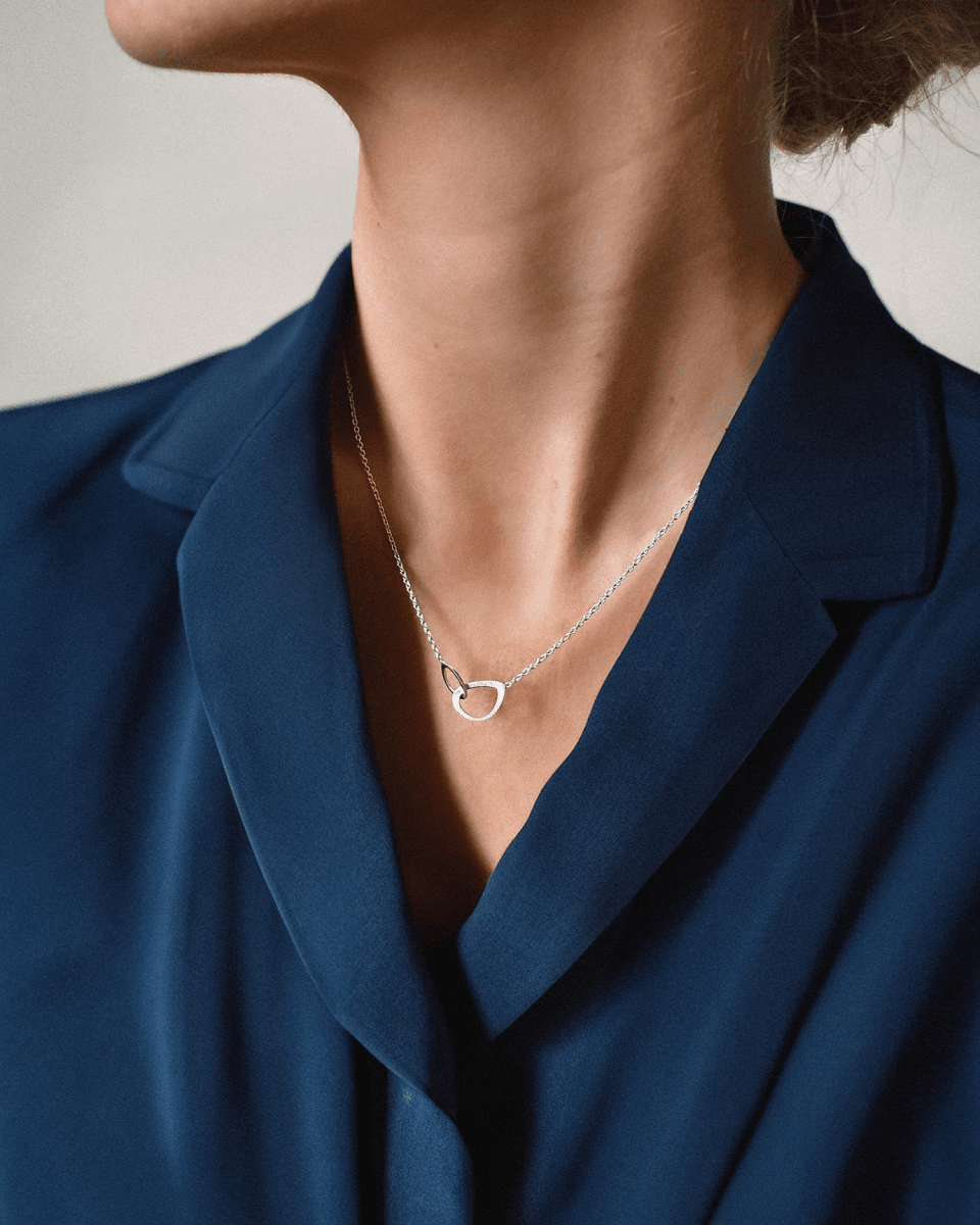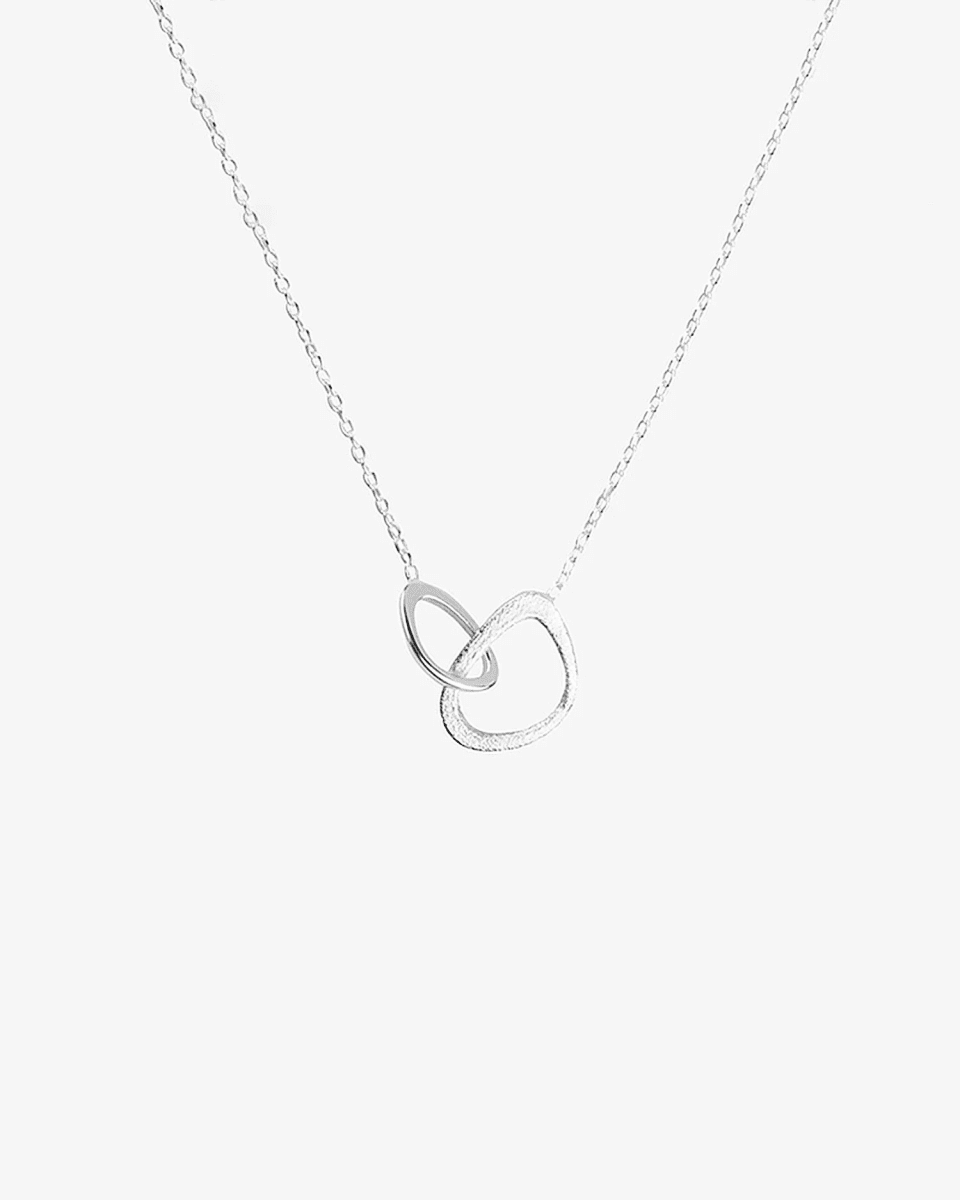Silverhalsband på kedja med två stycken hängen som sitter ihop tillsammans i en vacker organiskt formgivning. Den ena är i skimrande borstat silver och den andra i blank högpolerad silver.