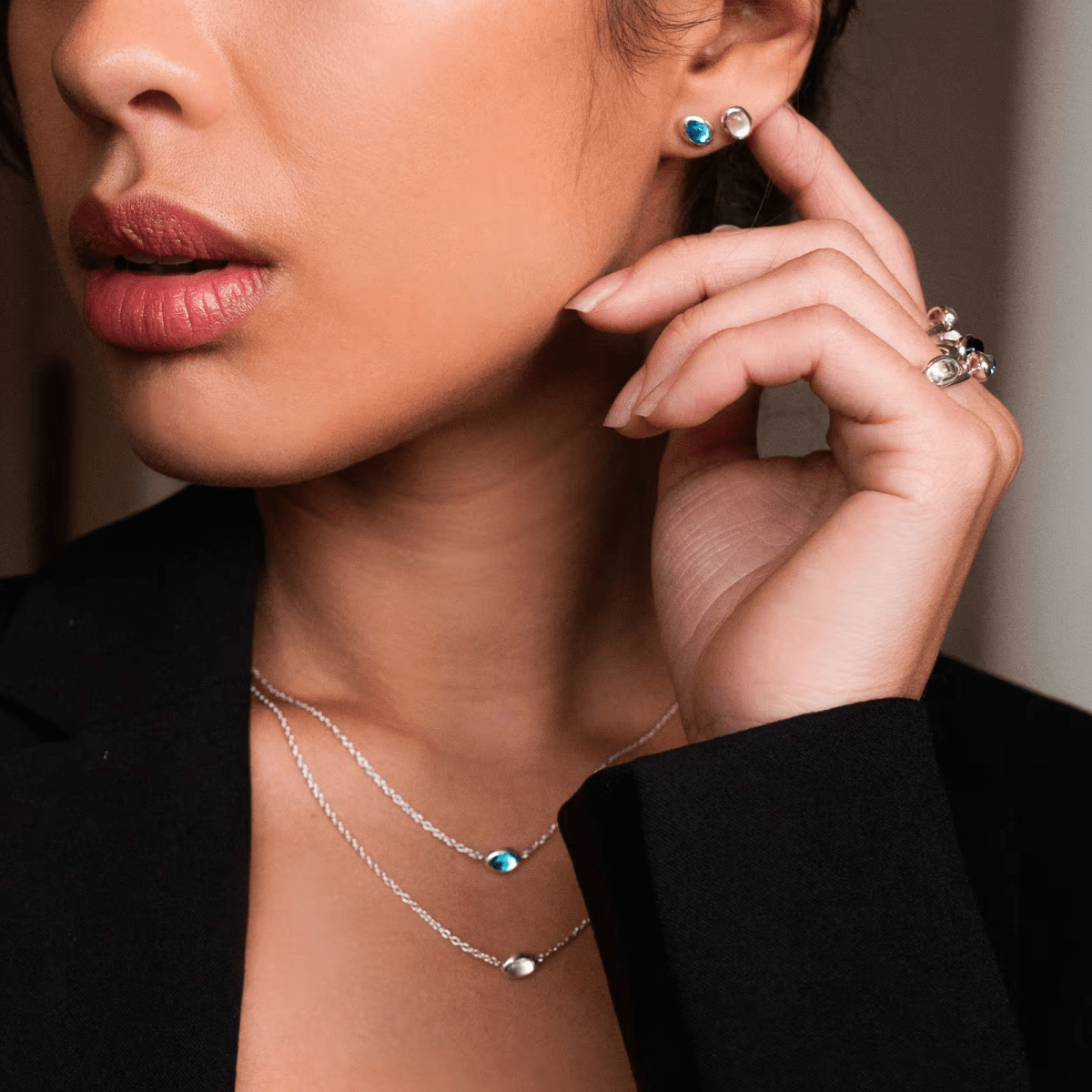 Halsband i återvunnet sterlingsilver med en liten böna med färgsten i rosenkvarts.