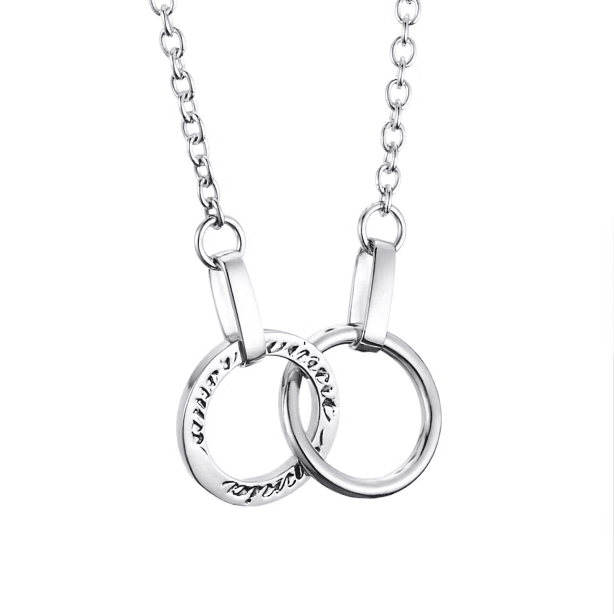 Halsband i återvunnet sterlingsilver med två ringar sammanlänkade. En rundad ring och en rutad med orden Amor Vincit Omnia - kärleken övervinner allt på latin.