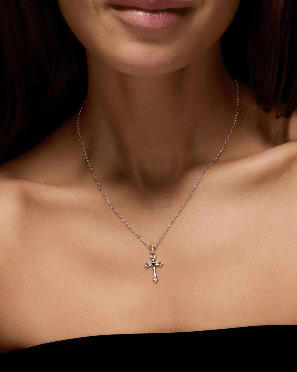 Inte bara en symbol, utan ett löfte. Halsbandet med hängivenhetskors är snidat i silver, ett tyst bevis på orubblig hängivenhet. Som en del av kollektionen "Sagan om Gargoylen" förkroppsligar det den styrka som krävs för att förbli ståndaktig, i ljus och i skugga.