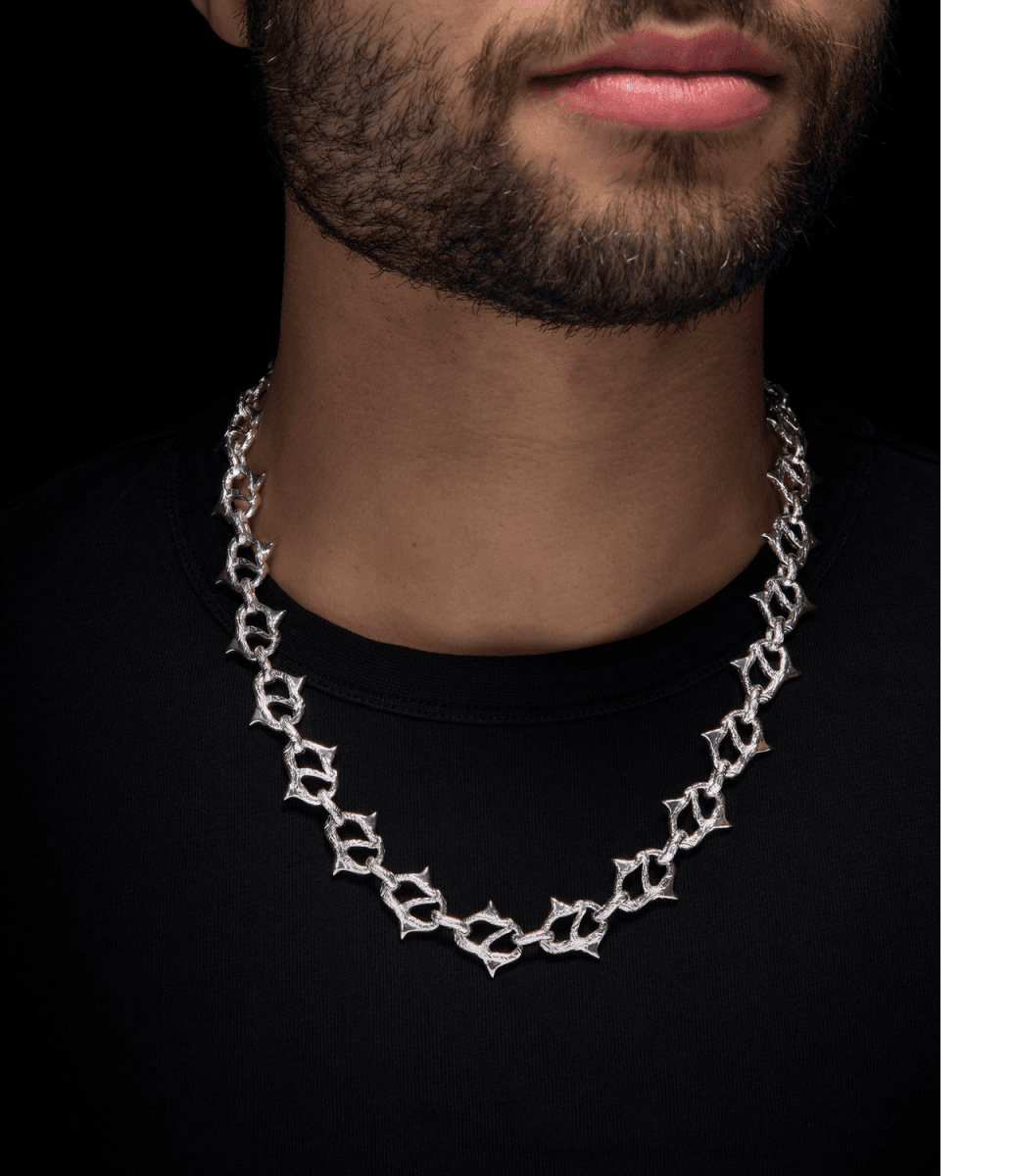 I den mörka skandinaviska skogen väntar den mytiska väktaren Huldra. Inspirerad av hennes livsmiljö, fylld av skönhet och fara, fångar det stora halsbandet med taggkedja den nordiska skogens dualitet. En skarp men elegant form förkroppsligar Huldras charm och motståndskraft och fungerar som en påminnelse om att fascinerande saker kan ha en dold prägel.