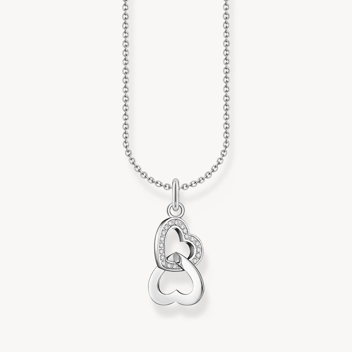 För evigt sammanlänkade – det symboliserar hängsmycket på den fina halskedjan av återvunnet silver. Det har formen av två hjärtan som är sammanlänkade i varandra och symboliserar bandet mellan två älskande. Ett av de båda hjärtana är högglansigt polerat, det andra är utsmyckat med vita, pavéinfattade zirkoniastenar. Detta betydelsefulla halsband med hängsmycke passar perfekt som present till din favoritperson.