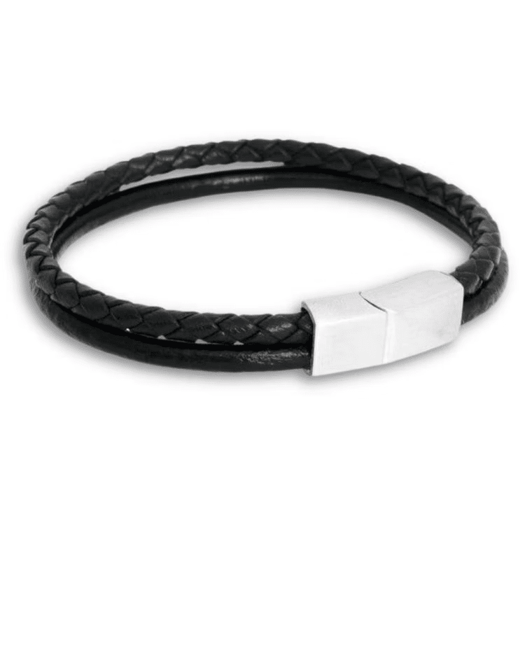 Klassiskt svart läderarmband med två remmar, varav den ena är slät och andra flätad. Läderarmbandet har ett magnetlås med länkar i stål.
