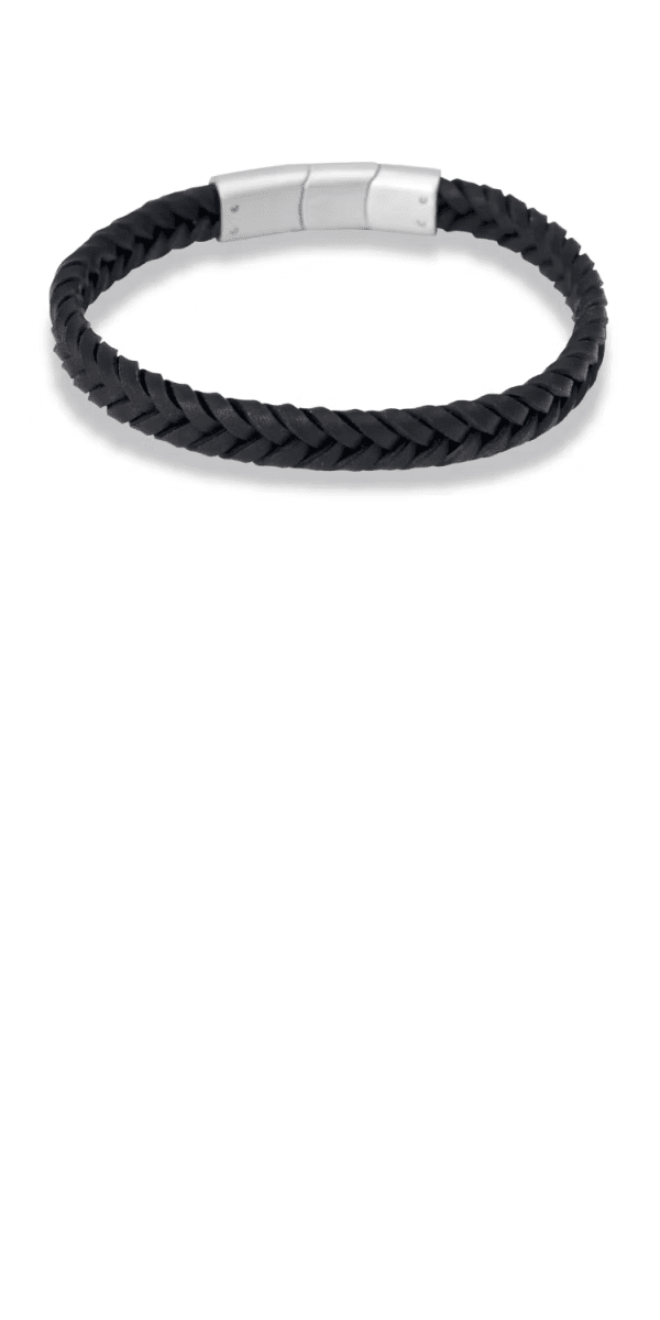 Ett elegant och tidlöst armband i svart flätat läder som ger en sofistikerad men avslappnad känsla. Den flätade strukturen skapar djup och karaktär, medan det stilrena låset i rostfritt stål ger en modern kontrast och säker passform.