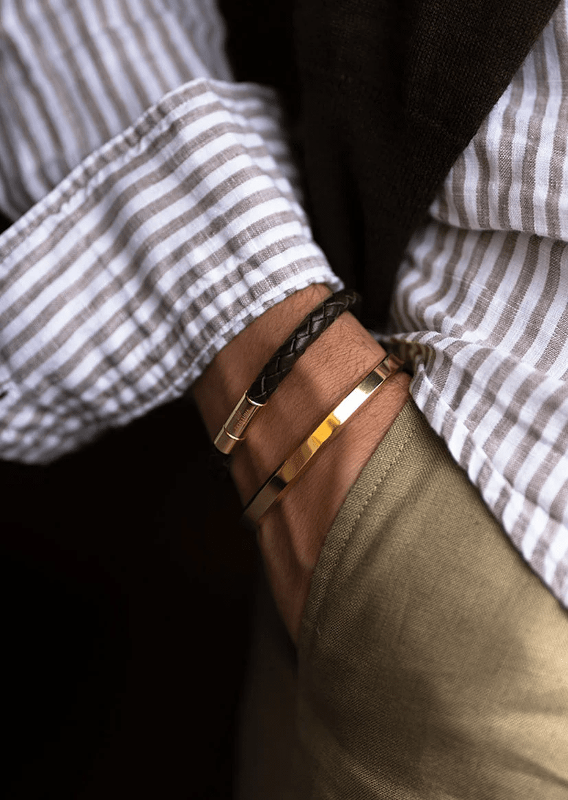 Ett stilrent armband med flätat läder och graverat lås. Låset har en dubbel-lås-mekanism för att säkra bäraren vid påtagning och användning av armbandet
