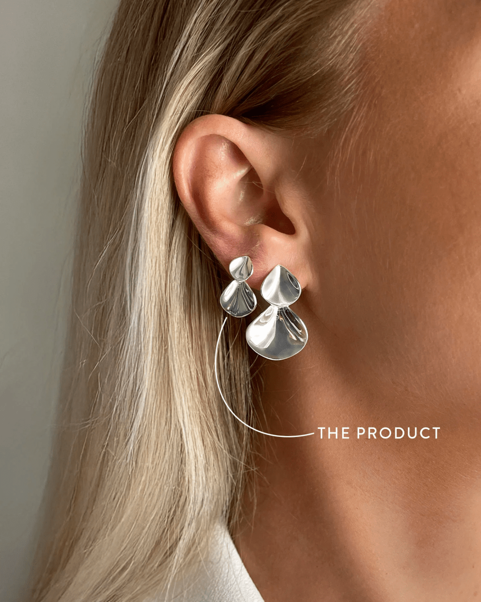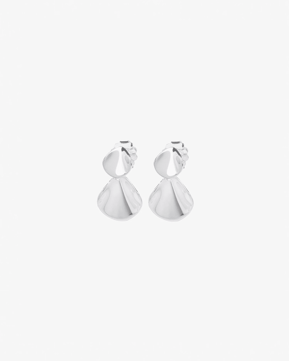 Ett par dinglande silverörhängen på stift. Smycket består av två organiska former, ett mindre och ett större, som överlappar varandra i polerat silver. Elegant och feminint smycke med inspiration från blomblad.