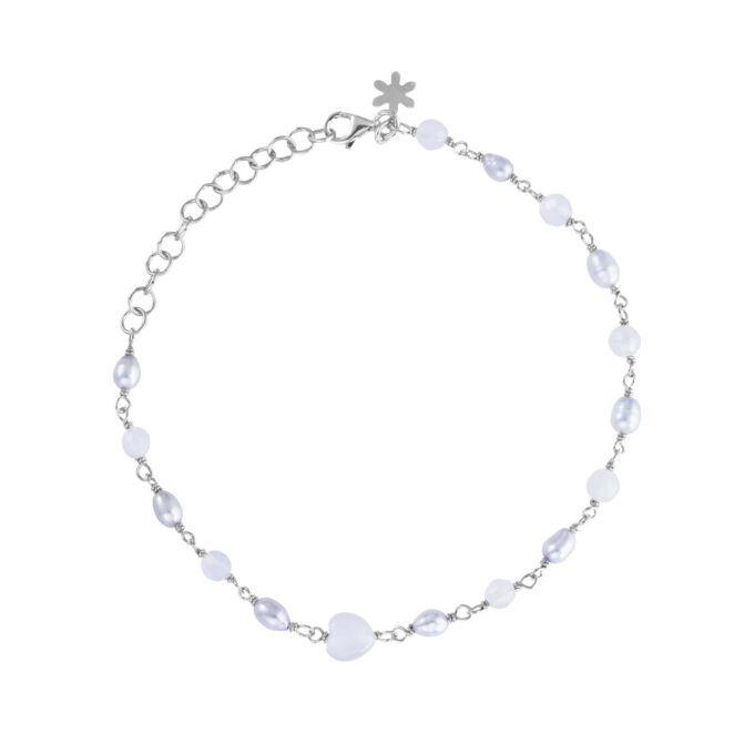 Armband 16-20 cm, silver, knutet med blå kalcedon och ljusblå sötvattenspärlor