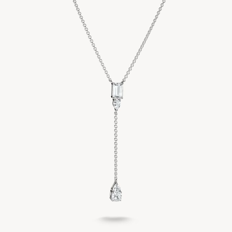 Den smickrande Y-formen förlänger halsen optiskt och drar blicken mot dekolletaget, medan vita zirkoniastenar i olika eleganta slipningar skapar ett intensivt ljusspel vid varje rörelse. Halsbandet förädlar enkelt allt från enkel t-shirt till cocktailklänning och blir snabbt ett favoritsmycke i vardagen såväl som en glänsande detalj till kvällslooken – perfekt för alla som älskar ren design med en touch av lyx.