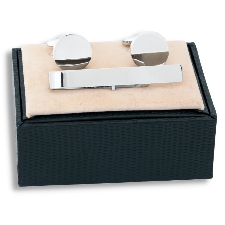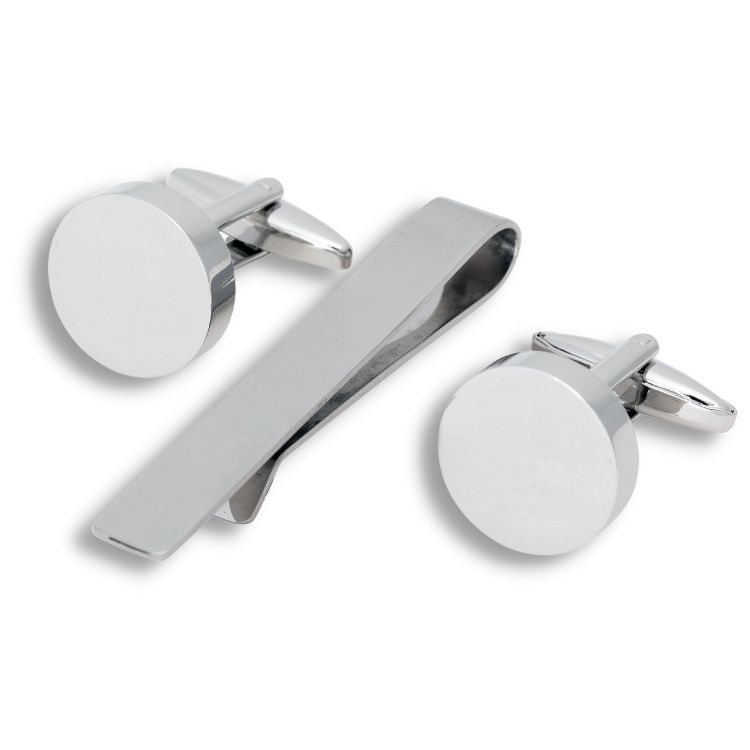 Ett klassiskt och stilrent set med runda, släta manschettknappar och matchande enkel slipsnål.