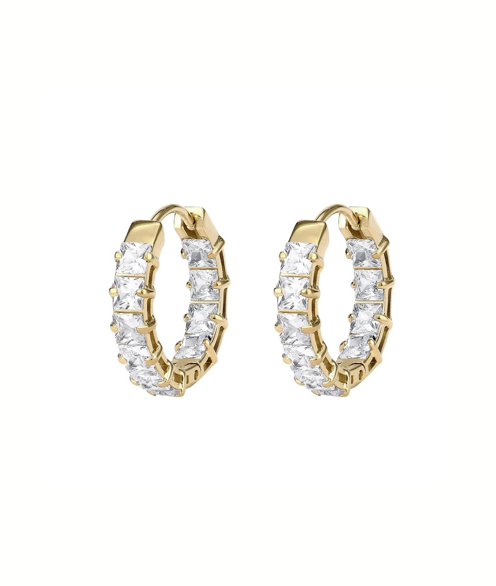 Blanka creoler i 14k guldpläterat stål med 4-kantiga, vackert gnistrande, infattade kristaller.