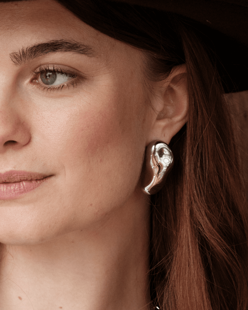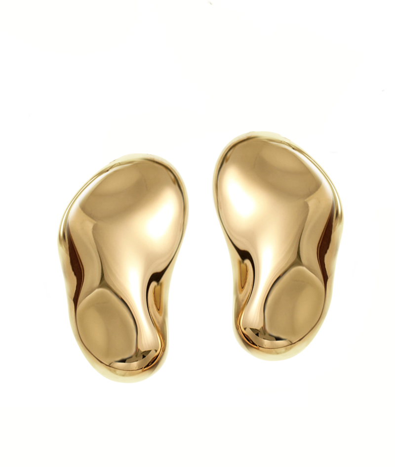 Örhängen på stift, tillverkade i 14 karat guldpläterat kirurgiskt rostfritt stål. Örhängena har en oregelbunden yta med blank finish.