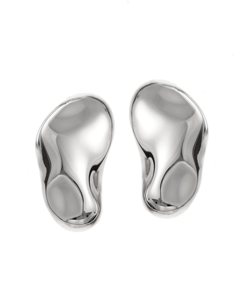 Örhängen på stift, tillverkade i kirurgiskt rostfritt stål. Örhängena har en oregelbunden yta med blank finish.