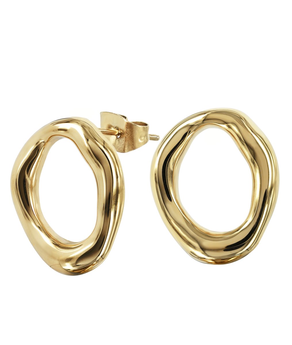Stora örhängen på stift i 14k Guldpläterat stål i form av ring med mjukt vågformad yta.