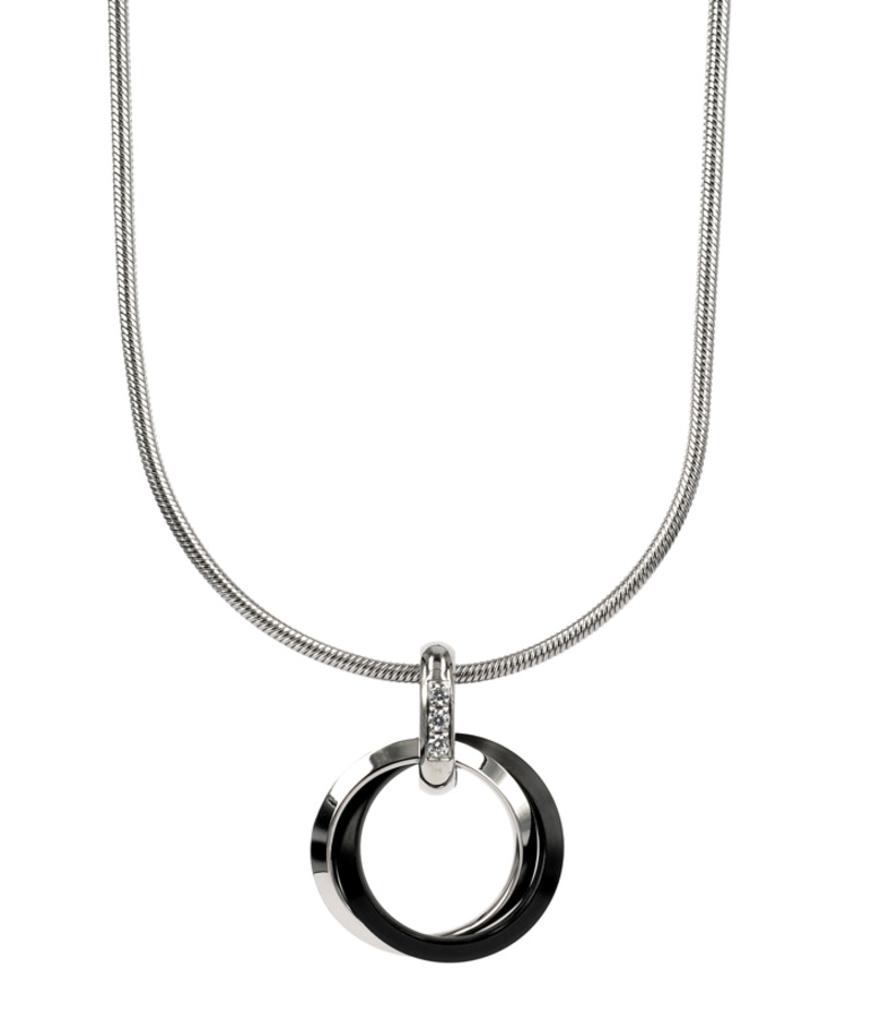 Kort halsband av ormkedja med ett hänge av 2 sammanlänkade ringar i kirurgiskt rostfritt stål med svart plätering av TiC (Svart Titan Karbid) - prydda med kristaller av Kubisk Zirkonia.