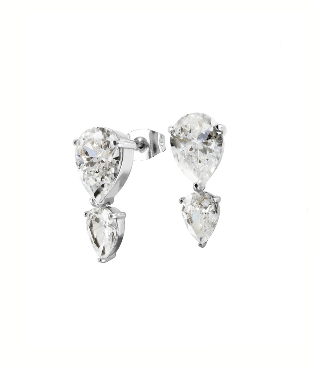 Hängande örhängen på stift i stål av 2st kloinfattade dropp-formade klara kristaller.