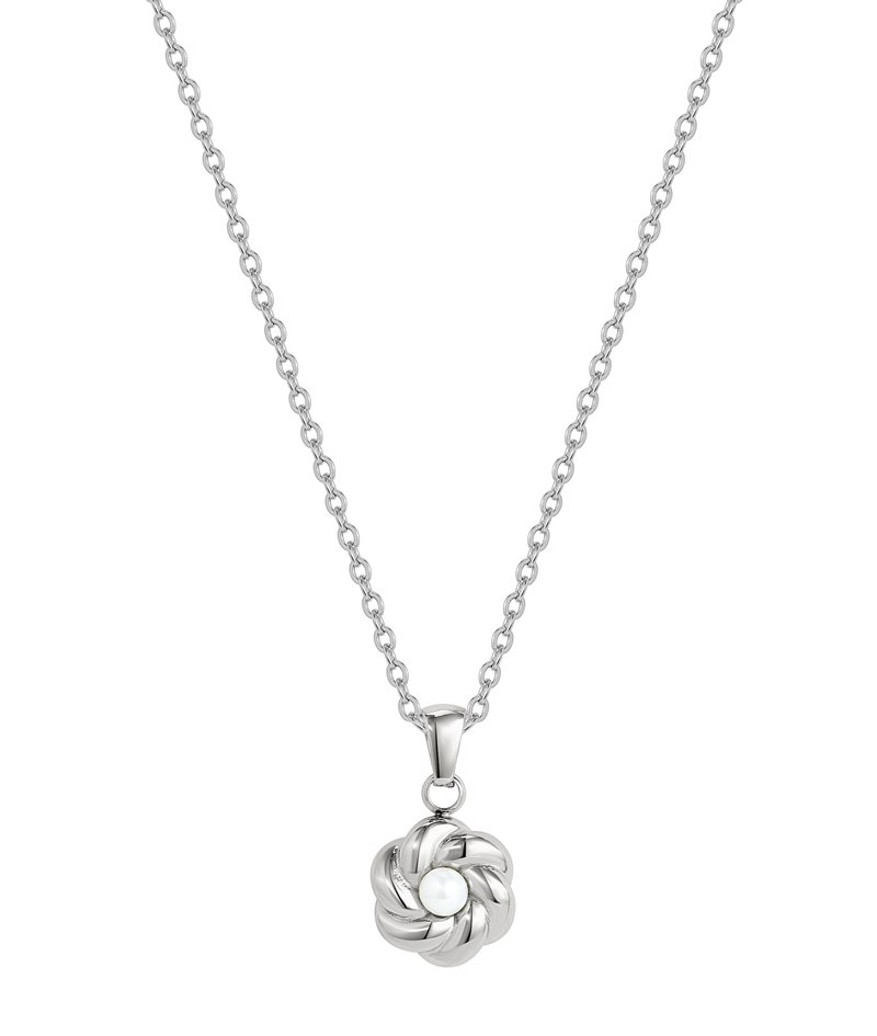 Halsband av nätt kedja med hänge i form av en mjukt rundad knut med en äkta sötvattenspärla i mitten. Halsbandet är skapat i stål med blank finish.