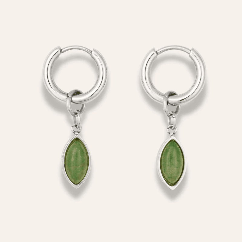 Stilrena hoops tillverkade i kirurgiskt stål, pryds med en vacker hängande grön aventurin