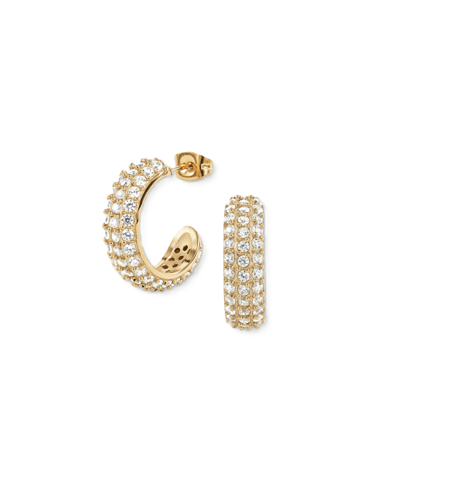 Harper är klassiska kreoler tillverkade av 14 karat guldpläterat stål, dekorerade med kloinfattade zirkoner över hela örhänget.