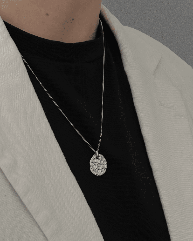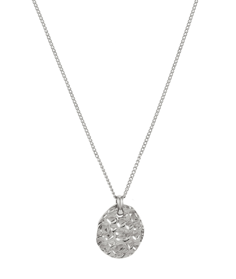 Långt halsband av nätt pansarlänk och ett hänge i organisk form, likt ett mynt. Halsbandet kan justeras till en kortare längd och är tillverkat av kirurgiskt rostfritt stål. Brickan har en hamrad- och en blank sida.
