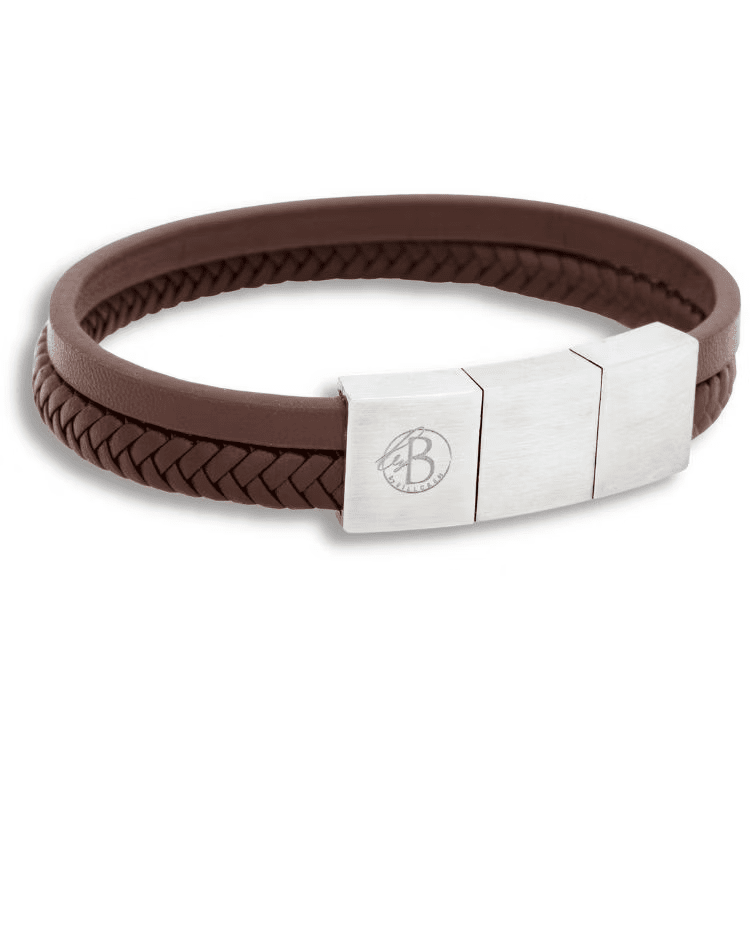 Ett stilsäkert brunt läderarmband med en design bestående av två remmar, varav den ena är slät och den andra är flätad.