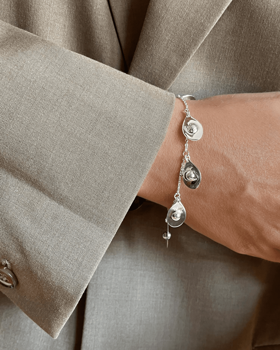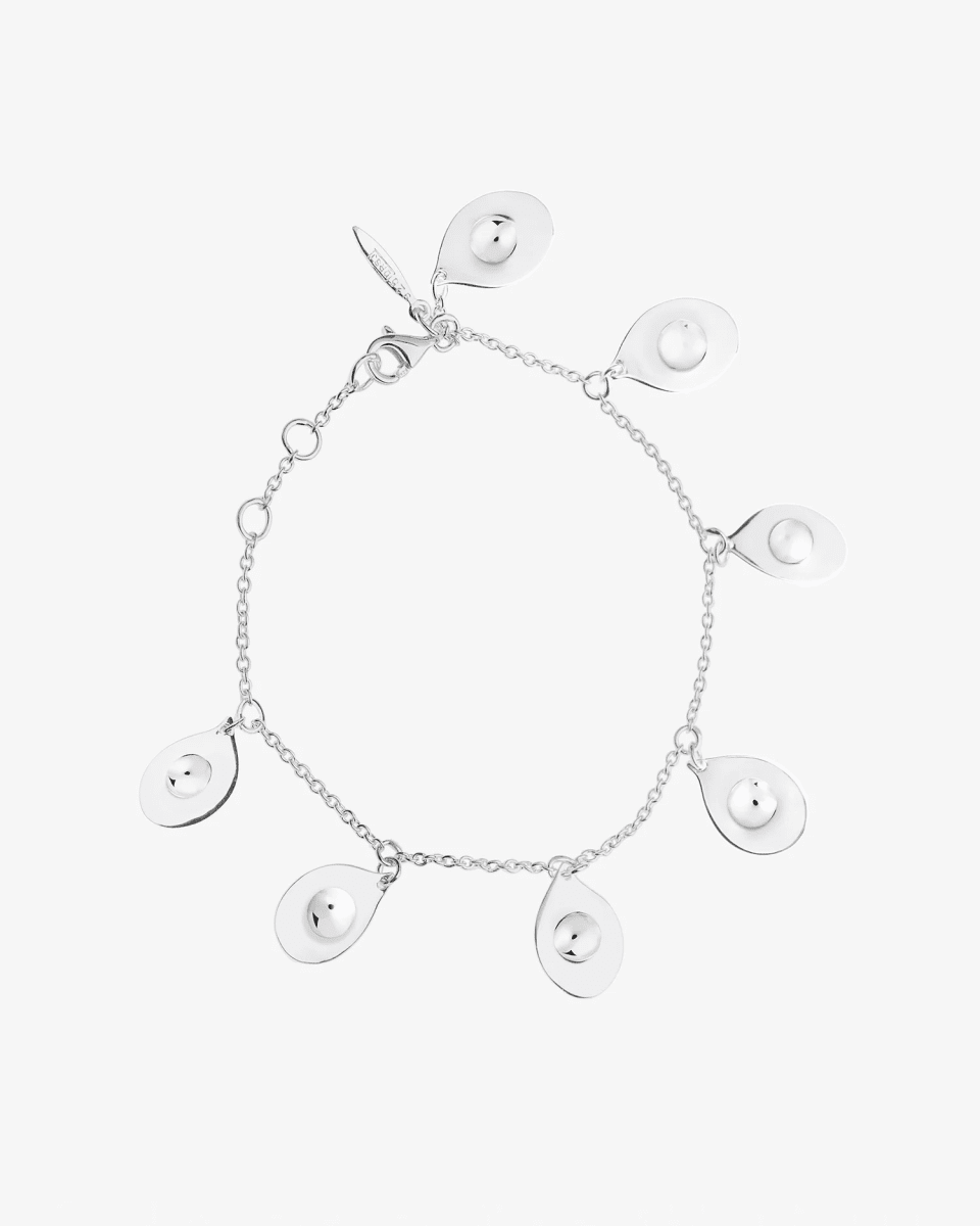 Ett silverarmband med dinglande hängen i polerat silver. Droppformade hängen/berlocker med en rund upphöjd detalj i mitten.