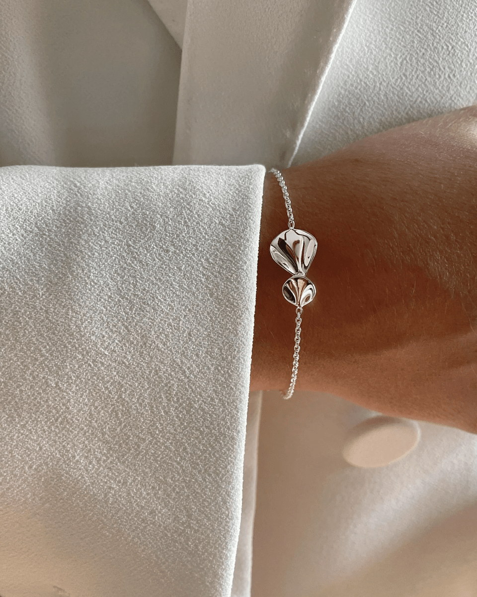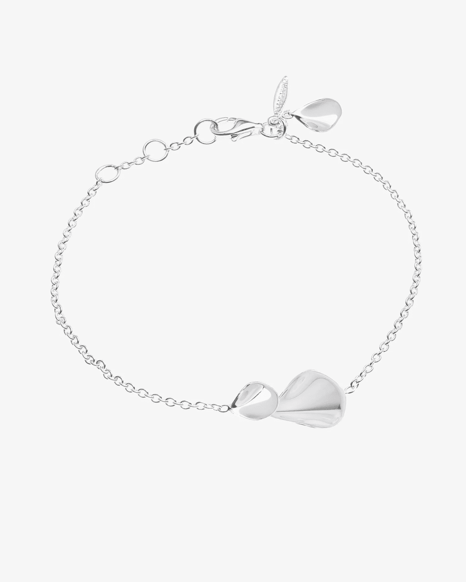 Ett vackert silverarmband. Smycket består av två organiska former, ett mindre och ett större, som överlappar varandra i polerat silver, inspirerade av blomblad. Elegant och feminint smycke.