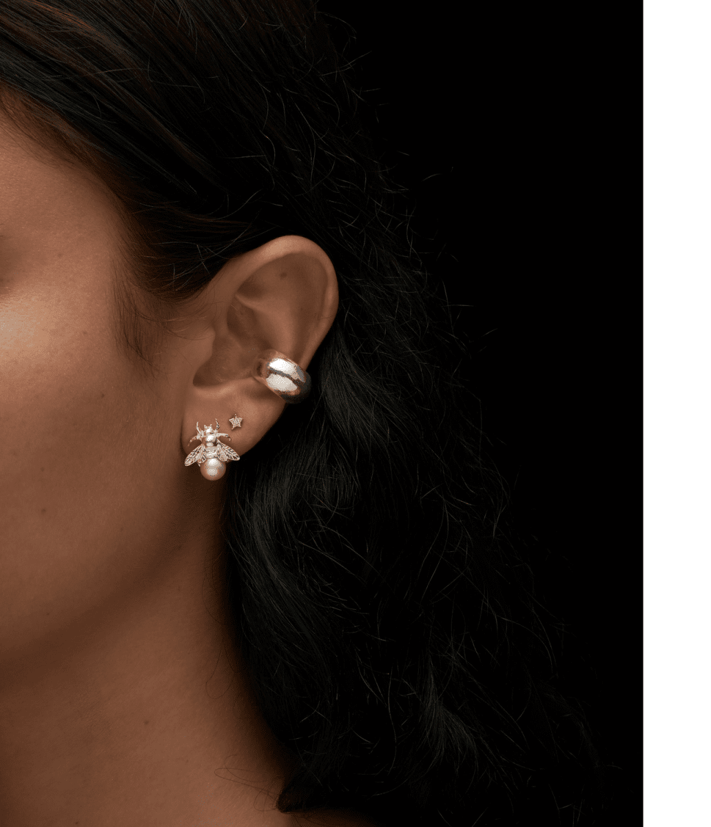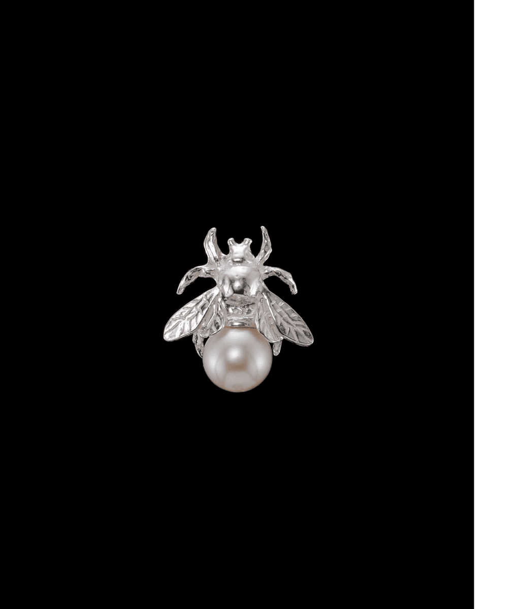 Örhänge i sterlingsilver med humlemotiv och en glänsande pärla. Detta silverörhänge erbjuder en blandning av naturinspirerad charm och förfinat hantverk