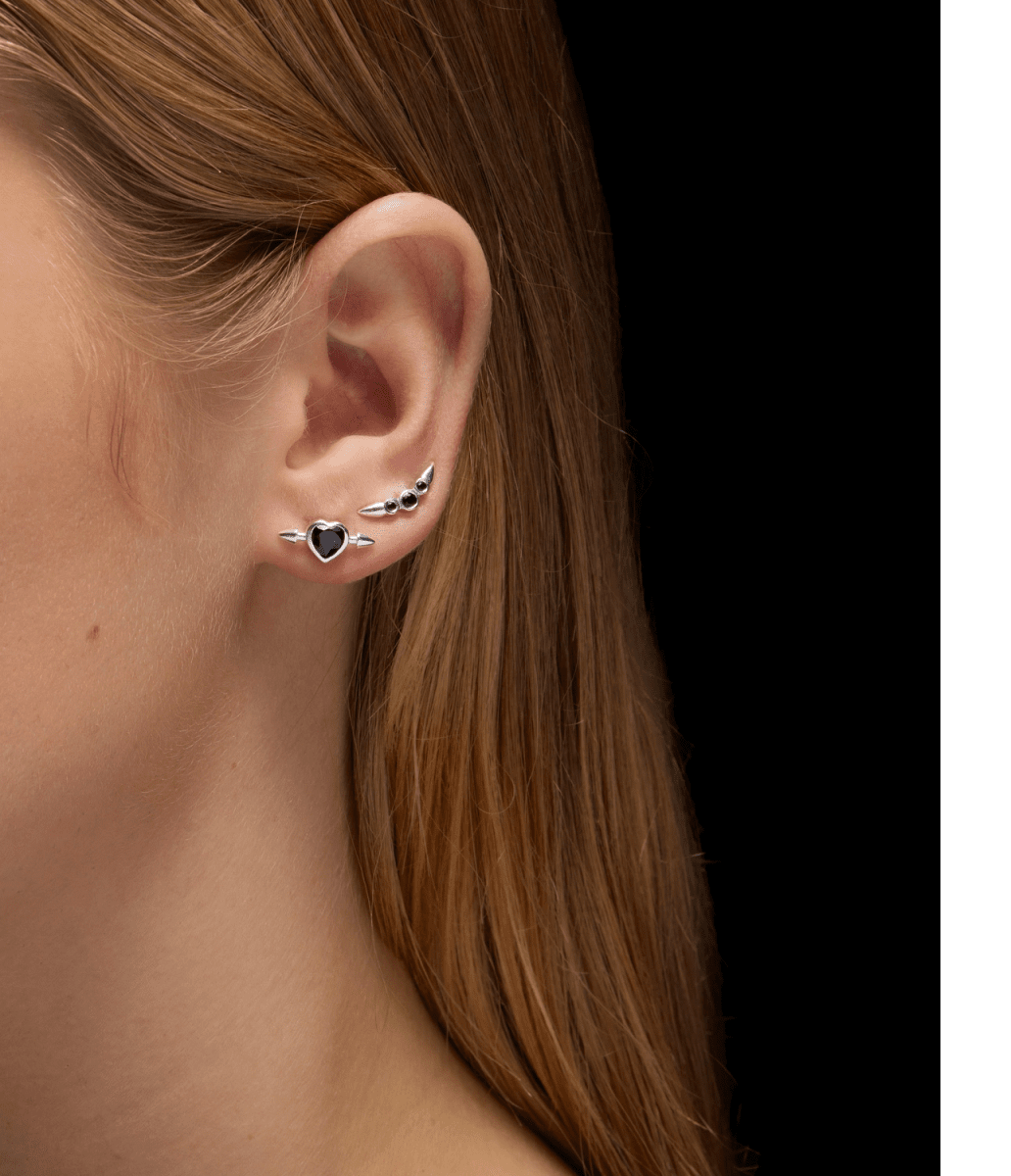 Örhänge i sterlingsilver med ett svart hjärta inramat av silverspikar.