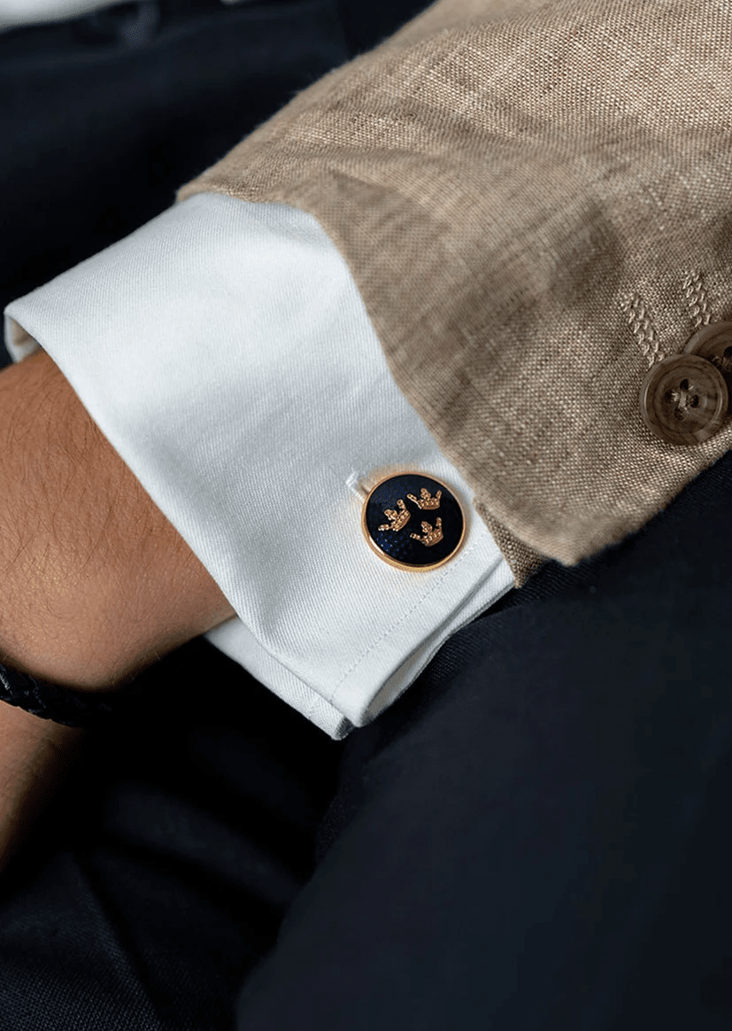 Sveriges urgamla riksvapnet med de tre kronorna på en blå bakgrund. Kungsblå emalj