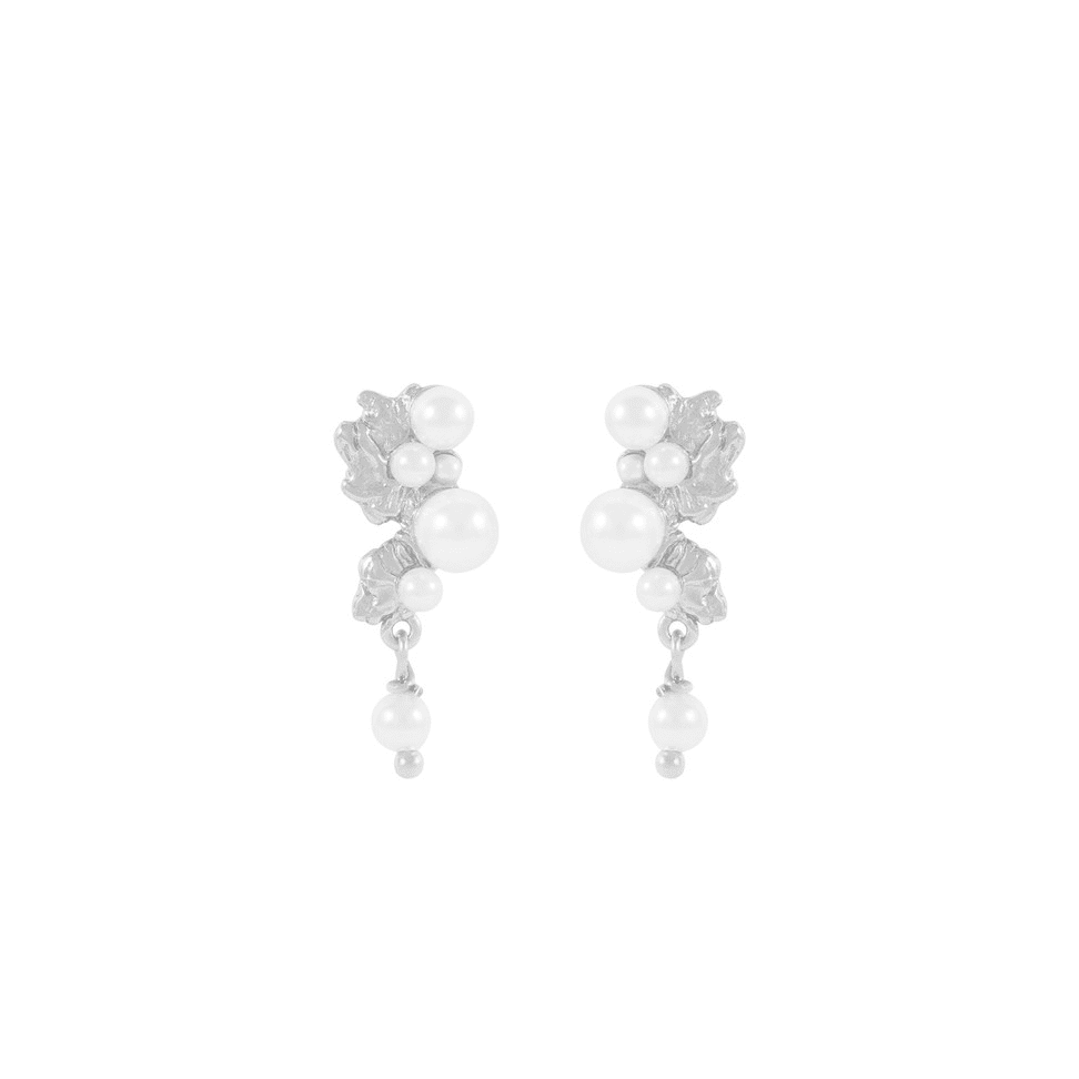 Eleganta örhängen med oregelbundna metallformer och pärldetaljer. Den unika designen ger en sofistikerad och dekorativ touch.