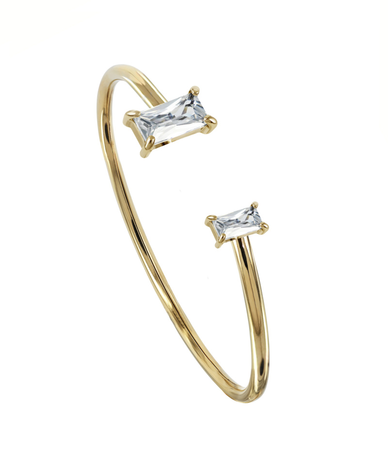 Melinda Open Bangle är en elegant armring med öppen design och baguette-slipade stenar av kubisk zirkon. Den öppna konstruktionen gör armringen något justerbar i storlek och möjliggör en bekväm passform för olika handleder. Armringen är tillverkad av allergivänligt stål med 14 karat guldplätering, vilket gör den lämplig för daglig användning även för kunder med känslig hud. Melinda Open Bangle är fin på egen hand, men också i kombination med övriga smycken i Melinda-serien. Rekommenderas att exponeras tillsammans med serien för en sammanhängande presentation och ökad merförsäljning.
