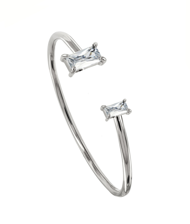 Melinda Open Bangle är en elegant armring med öppen design och baguette-slipade stenar av kubisk zirkon. Den öppna konstruktionen gör armringen något justerbar i storlek och möjliggör en bekväm passform för olika handleder. Armringen är tillverkad av allergivänligt stål, vilket gör den lämplig för daglig användning även för kunder med känslig hud. Melinda Open Bangle är fin på egen hand, men också i kombination med övriga smycken i Melinda-serien. Rekommenderas att exponeras tillsammans med serien för en sammanhängande presentation och ökad merförsäljning.