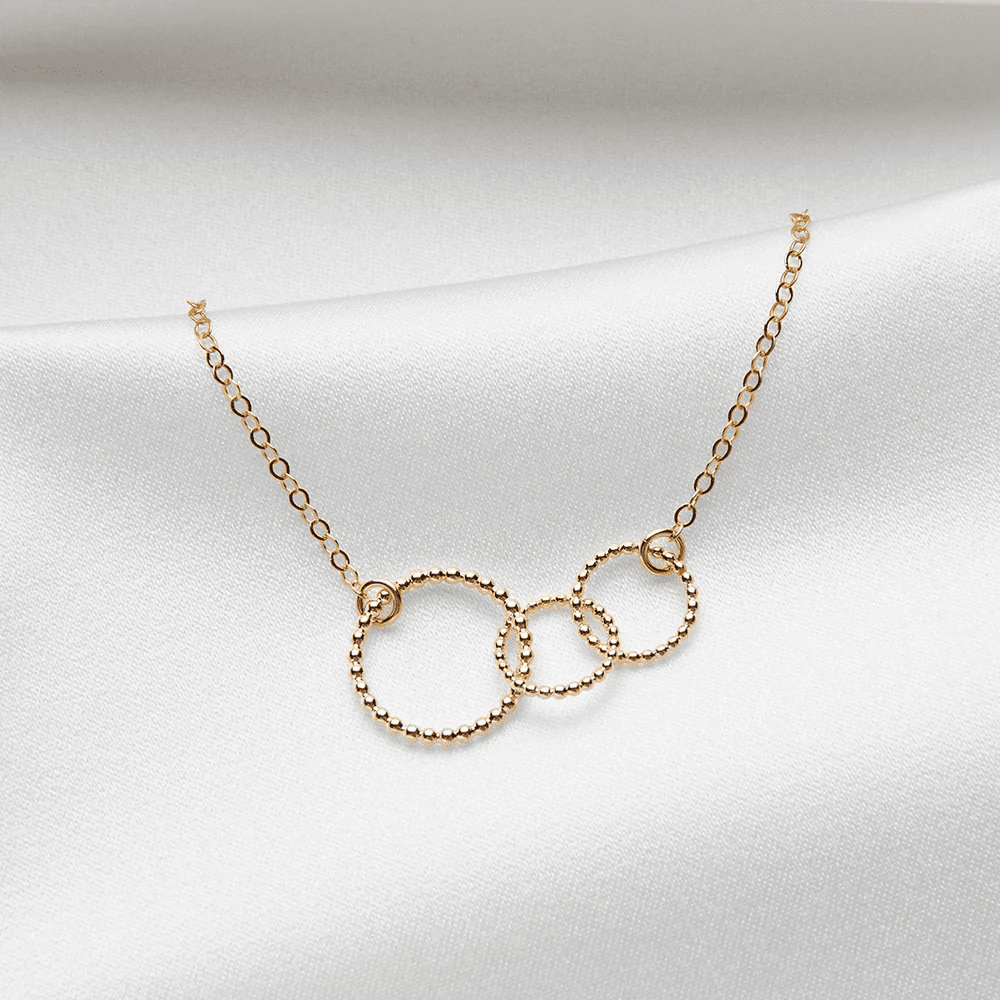 Ett vackert handarbetat guldpläterat halsband från kollektionen Mamma, design av Sofia Wistam. Den stora ringen symboliserar modern och de små ringarna barnen.