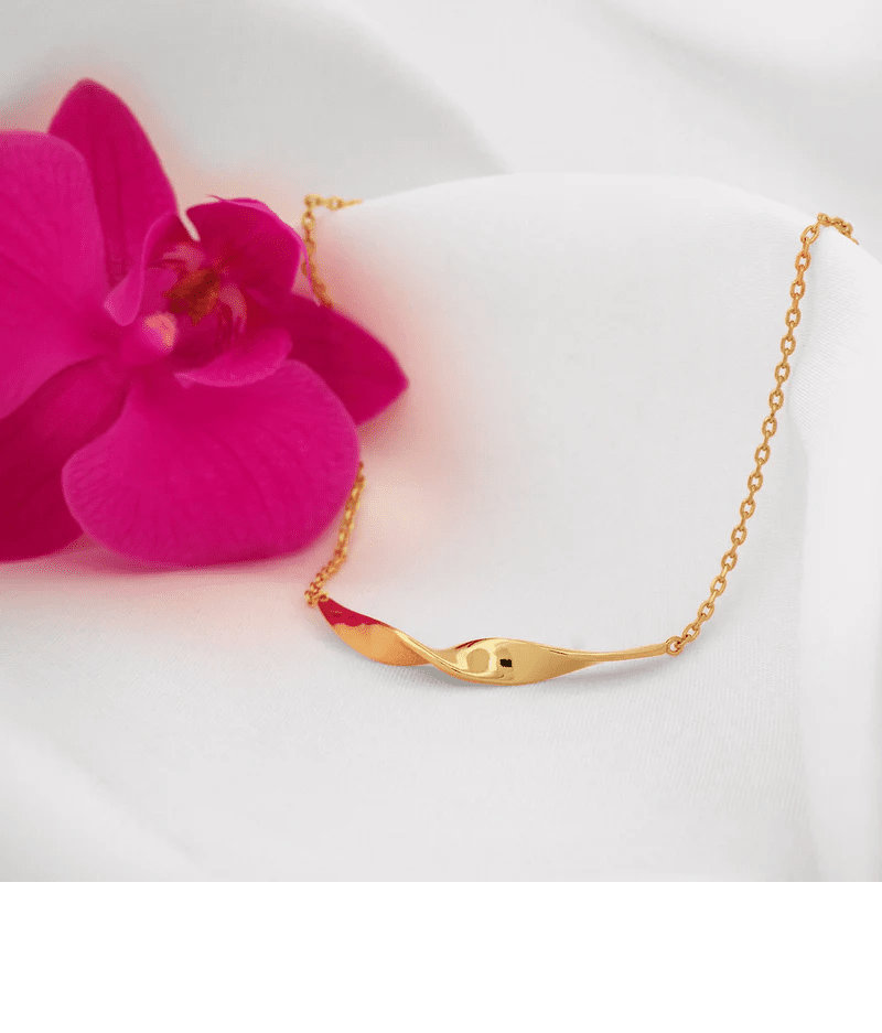 Handarbetat guldpläterat halsband från kollektionen Twirl, design av Sofia Wistam.